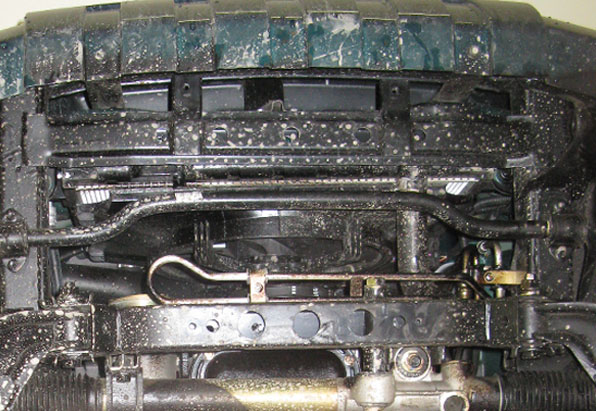 1. Снять штатный пыльник. Установить задние крепежные точки Защиты на подрамник при помощи штатного крепежа. 2. Установить передние крепежные точки Защиты на поперечную балку радиатора при помощи штатного крепежа.
