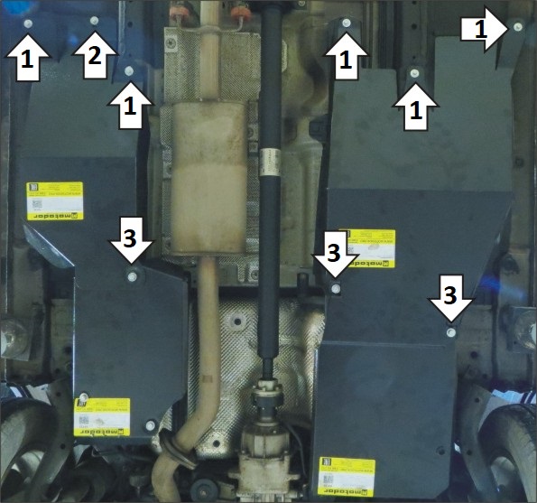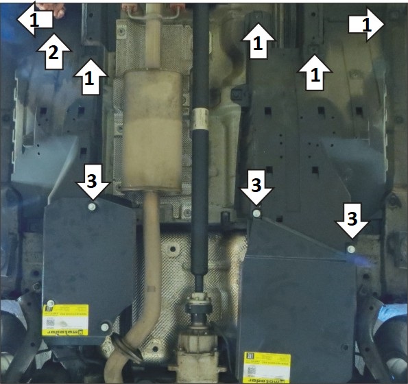 Защита устанавливается только совместно с защитой топливного бака Motodor! 1. Вывернуть штатные болты крепления пыльника и в штатные резьбовые отверстия закрепить передние точки крепления защиты при помощи проставок 10, болтов М6х30 с шайбами 8, шайбами 6 и гр. шайбами 6. 2. Вывернуть штатный болт крепления пыльника и в штатное резьбовое отверстие закрепить переднюю точку крепления защиты при помощи проставки 10, болта М6х40 с шайбой 8, шайблй 6 и гр. шайбой 6. 3. Закрепить задние точки крепления защиты совместно с защитой топливного бака Motodor. Затянуть весь крепеж.