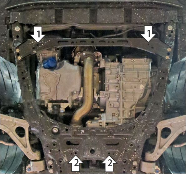 1. Снять центральную часть штатного пыльника (больше не понадобится). На штатные отверстия в подрамнике подвески установить закладные планки ПЗ79х20х6 М10 (устанавливаются поверх подрамника) и прикрепить к ним кронштейны при помощи болтов М10х40 с шайбами и гр. шайбами 10, с левой стороны проделать отверстие в пыльнике под кронштейн. 2. Снять клипсы крепления задней части штатного пыльника, в штатные отверстия установить закладные планки ПР70х20х6 М10 и прикрепить к ним задние точки крепления щита при помощи болтов М10х30 с шайбами и гр. шайбами 10, предварительно вернув на место пыльник и сделав в нём отверстия под болты. 3. Прикрепить щит к кронштейнам при помощи болтов М10х30 с шайбами и гр. шайбами 10. Затянуть весь крепеж с необходимым усилием.