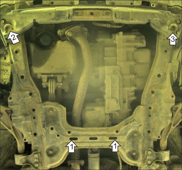 1. В штатные отверстия в подрамнике автомобиля установить задние точки крепления защиты при помощи планок ПР 70х20х6 А15 М10, болтов М10х30 с шайбами и гр. шайбами 10. 2. Установить переднюю правую точку крепления защиты к штатной буксировочной проушине а/м при помощи проушины, планки ПР 80х20х6 М10, проставки 15 и болта М10х40 с шайбой и гр. шайбой 10 таким образом, чтобы проушина находилась между штатной автомобильной проушиной и защитой. 3. Установить переднюю левую точку защиты к штатной буксировочной проушине а/м при помощи планки ПР 80х20х6 М10, проставки 15, болта М10х40 с шайбой и гр. шайбой 10.