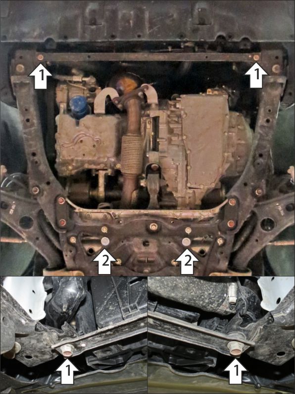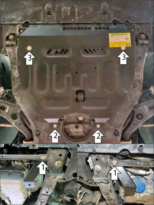 1. Снять центральную часть штатного пыльника (больше не понадобится). Под штатные болты крепления поперечины подрамника прикрепить кронштейны. 2. Снять клипсы крепления задней части штатного пыльника, в штатные отверстия установить закладные планки ПР70х20х6 М10 и прикрепить к ним задние точки крепления щита при помощи болтов М10х30 с шайбами и гр. шайбами 10, предварительно вернув на место пыльник и сделав в нём отверстия под болты. 3. Прикрепить щит к кронштейнам при помощи болтов М10х30 с шайбами и гр. шайбами 10. Затянуть весь крепеж с необходимым усилием.