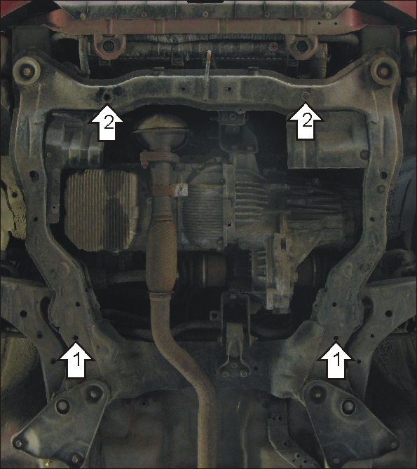 1.Соосно с отверстиями в задней части подрамника двигателя установить ПР 70х20х6 А15 М10 и наживить Болты М10х80 с Шайбами и Гр. Шайбами 10. Завести задние точки защиты. 2.Соосно с отверстиями в передней части подрамника установить ПЗ 61х20х6 А40 М10 и закрепить передние точки защиты Болтами М10х80 с Шайбами и Гр. Шайбами 10.