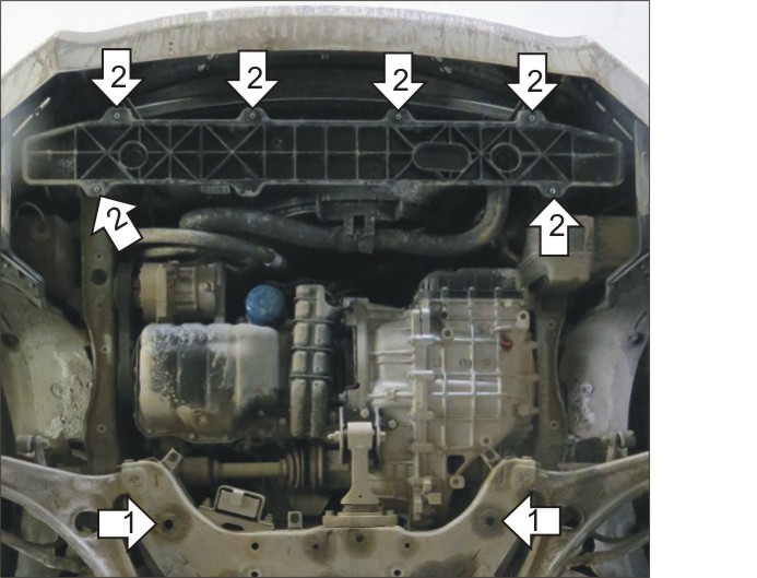 1. Установить в отверстия подрамника задние точки защиты с помощью ПУ 60х14х6 М8, болтов М8х30, шайб и гр. шайб 8. 2. Установить на подрадиаторную балку передние точки защиты, используя болты М6х40 с шайбами гр. шайбами 6 и проставки 15 при необходимости. Затянуть весь крепеж.