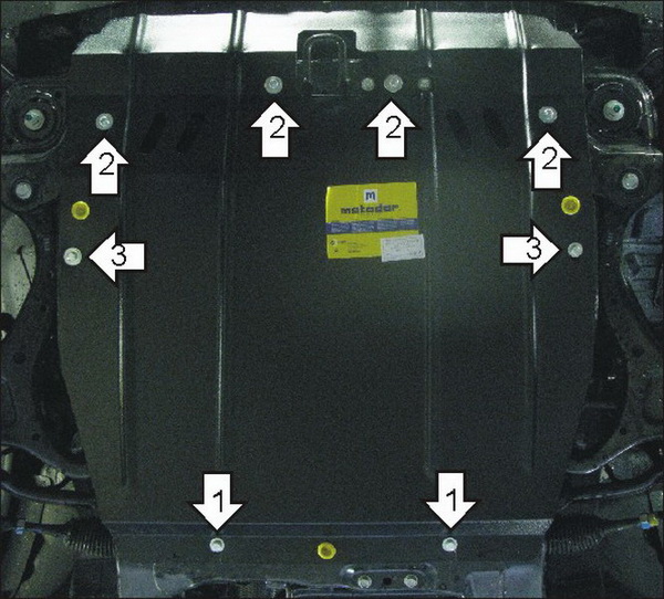 1.В отверстия подрамника закрепить ПУ 60х14 А20В10 М8 и наживить Болты М8х40 с Шайбами и Гр. Шайбами 8. Завести задние точки защиты. 2.Закрепить передние точки защиты в отверстия подрамника, используя Болты М8х40, Шайбы 10, Шайбы и гр. Шайбы 8. 3. Закрепить средние точки защиты Болтами М8х40 с Шайбами и гр. Шайбами 8.