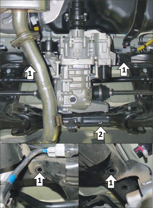 1.В штатные отверстия в подрамнике задней подвески установить кронштейны при помощи планок ПЗ 61х20х6 М10, болтов М10х100, гр. шайб и шайб 10. 2. В штатное отверстие в подрамнике задней подвески установить заднюю точку крепления защиты при помощи закладываемой внутрь планки ПР 50х20х6 М8, болта М8х30, гр. шайбы и шайбы 8. 3. Прикрепить щит к кронштейнам при помощи болтов М8х20, гр. шайб и шайб 8. Затянуть весь крепеж.