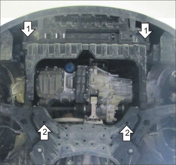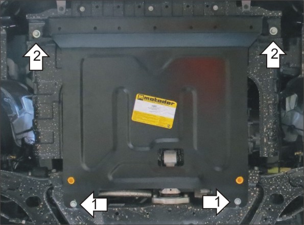1. Прикрепить на штатные отверстия поперечной балки под радиатором Кронштейны при помощи Планок ПР 50х20х6 М8 и Болтов М8х30, Гр 8 и Ш 8. 2. Установить в отверстия подрамника а/м задние точки Щита при помощи ПУ 60х14х6 А20В10 М8 и Болтов М8х30, Гр 8 и Ш 8. 3. Прикрепить передние точки крепления Щита к Кронштейнам при помощи Болтов М8х20 с Шайбами и Гр. Шайбами 8. Затянуть весь крепеж.