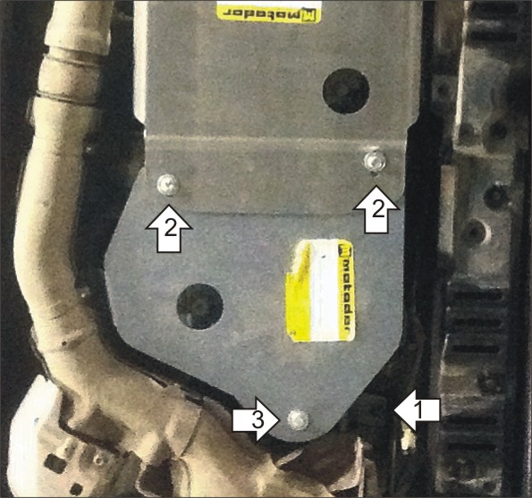 1. Установить Кронштейн под штатный болт. 2. Установить переднюю часть Щита совместно с Защитой арт. 38006, используя крепеж защиты арт. 38006. 3. Прикрепить Щит к Кронштейну при помощи Болта М10х30 с Шайбой и Гр. Шайбой 10. Затянуть весь крепеж.