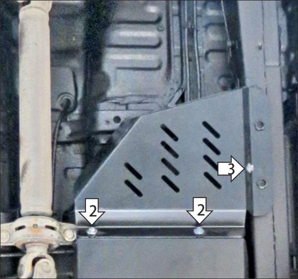 Защита устанавливается только совместно с защитой топливного бака Motodor! 1. В штатное отверстие в лонжероне рамы установить кронштейн при помощи закладной планки ПУ60х14х6 М8 и болта М8х30 с шайбой и гр. шайбой 8. 2. Отвернуть на несколько оборотов болты крепления защиты топливного бака к передним кронштейнам и установить под них задние точки крепления щита. 3. Прикрепить щит к кронштейну при помощи болта М8х30 с шайбой и гр. шайбой 8. Затянуть весь крепеж с требуемым усилием.