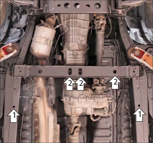 1. В штатные отверстия в раме установить балку при помощи закладных планок ПУ60х14х6 М8 и болтов М8х30 с шайбами и гр. шайбами 8. 2. В штатные отверстия в поперечине рамы установить передние точки крепления щита при помощи закладных планок ПР80х20х6 М10 и болтов М10х30 с шайбам и гр. шайбами 10. 3.Прикрепить задние точки крепления щита к балке при помощи болтов М10х20 с шайбам и гр. шайбами 10. Затянуть весь крепеж с требуемым усилием.