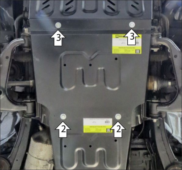 Защита устанавливается вместо штатной защиты двигателя. Снять штатную защиту двигателя при наличии. 1. В штатные отверстия в поперечине рамы установить кронштейн при помощи закладных планок ПР70х20х6 М10 и болтов М10х30 с шайбам и гр. шайбами 10. 2. В штатные отверстия в поперечине рамы установить задние точки крепления щита при помощи закладных планок ПР80х20х6 М10 и болтов М10х30 с шайбам и гр. шайбами 10. 3. Прикрепить передние точки крепления щита к кронштейну при помощи болтов М10х30 с шайбам и гр. шайбами 10. Затянуть весь крепеж с требуемым усилием.