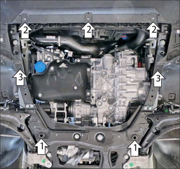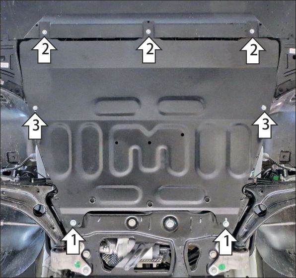 1. Снять штатный пластиковый пыльник. Завести переднюю часть защиты под бампер и установить задние точки крепления защиты в штатные отверстия в подрамнике автомобиля при помощи закладных планок ПУ60х14х6 М8, болтов М8х30 с шайбами и гр. шайбами 8. 2. Прикрепить защиту в штатные резьбовые отверстия в рамке радиатора при помощи болтов М6х30 с шайбами и гр. шайбами 6. 3. Прикрепить защиту в штатные резьбовые отверстия при помощи проставок 45, болтов М6х70 с шайбами и гр. шайбами 6. Затянуть весь крепеж.