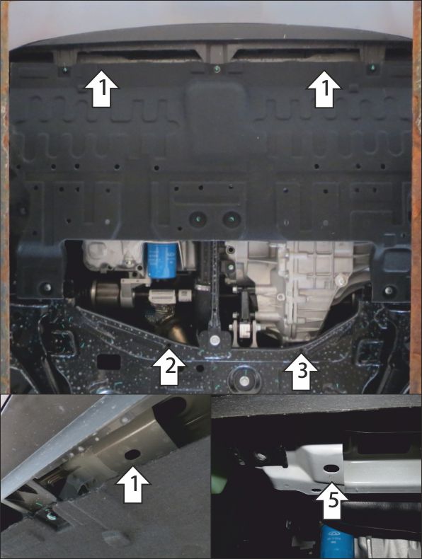 1. Только для автомобилей с двигателем объёмом 1,6 литра: открутить переднюю часть пыльника, на рамку радиатора установить планки ПР50х20х6 М8, и прикрепить к ним кронштейны при помощи болтов М8х30, шайб и гр. шайб 8. Вернуть на место пыльник. 2. Установить заднюю левую точку крепления защиты в штатное отверстие в подрамнике при помощи планки ПР30х14х6 М8, болта М8х30, шайбы и гр. шайбы 8. 3. Установить заднюю правую точку крепления защиты в штатное отверстие в подрамнике при помощи планки ПР50х20х6 М8, болта М8х30, шайбы и гр. шайбы 8. 4. Только для автомобилей с двигателем объёмом 1,6 литра: прикрепить щит к кронштейнам при помощи болтов М8х20, шайб и гр. шайб 8. 5. Только для автомобилей с двигателем объёмом 2,0 литра: на рамку радиатора установить планки ПР50х20х6 М8, проделать в пыльнике отверстия под болты и прикрепить защиту к планкам при помощи болтов М8х30, шайб и гр. шайб 8. Затянуть весь крепеж.