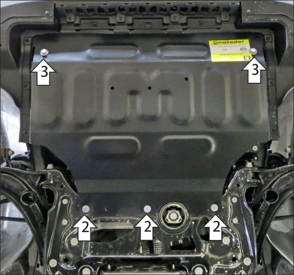 1. Снять штатный пластиковый пыльник. Установить в отверстия лонжеронов кронштейны с помощью планок ПР 80х20х6 М10, болтов М10х30 с шайбами и гр. шайбами 10. Вернуть на место пыльник, сделав в нём вырезы под кронштейны. 2. Установить задние точки крепления защиты в штатные отверстия в подрамнике автомобиля при помощи болтов М8х30 с шайбами и гр. шайбами 8. 3. Прикрепить щит к кронштейнам с помощью болтов М8х30 с шайбами и гр. шайбами 8. Затянуть все элементы крепления с необходимым усилием.