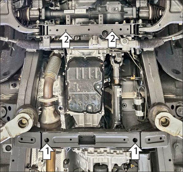 1. В штатные отверстия в поперечине рамы установить задние точки крепления защиты при помощи закладных планок ПР70х20х6 М10 и болтов М10х30 с шайбами и гр. шайбами 10. 2. В штатные резьбовые отверстия в поперечине рамы установить передние точки крепления защиты при помощи болтов М8х30 с шайбами и гр. шайбами 8. Затянуть весь крепеж с требуемым усилием.