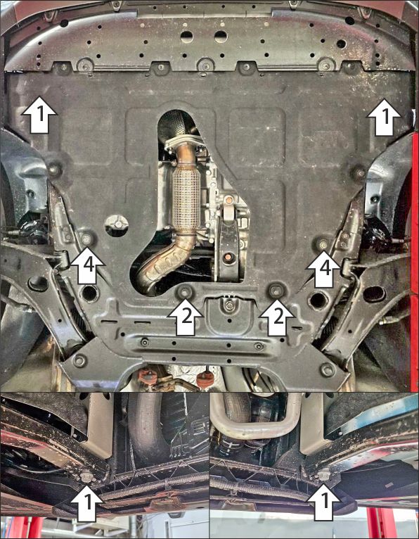 1. Снять штатный тканевый пыльник. Под штатные болты крепления продольных балок к рамке радиатора установить передние кронштейны защиты картера. Вернуть штатный пыльник на место, предварительно сделав вырезы под кронштейны. 2. В штатные резьбовые отверстия в подрамнике автомобиля установить задние точки крепления крепления защиты при помощи проставок 20, болтов М8х40 с шайбами и гр. шайбами 8. 3. Прикрепить щит к кронштейнам при помощи болтов М8х20 с шайбами и гр. шайбами 8. 4. В штатные резьбовые отверстия в подрамнике автомобиля установить средние точки крепления крепления защиты при помощи болтов М8х60, проставок 35 с шайбами и гр. шайбами 8. Затянуть весь крепеж с необходимым усилием.