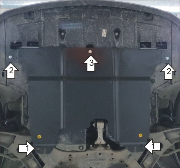 1. Установить задние точки крепления Защиты на отверстия в подрамнике при помощи ПУ 60х14х6 А10В20 М8, Болтов М8х30, Шайб 10, Шайб 8 и Гр. Шайб 8. 2. Установить на места штатных болтов боковые передние точки Защиты при помощи Проставок 35, Болтов М6х60, Шайб 8, Шайб 6 и Гр. Шайбы 6. 3. Установить на место штатного болта среднюю переднюю точку Защиты при помощи Проставки 45, Болта М6х70, Шайбы 8, Шайбы 6 и Гр. Шайбы 6. Затянуть все точки крепления.