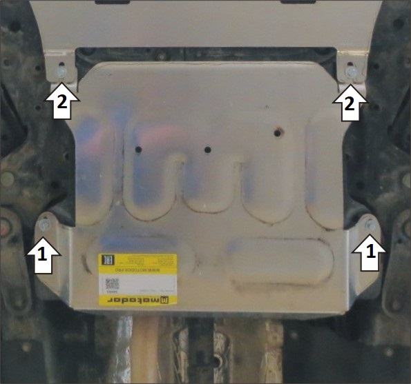 1. В штатные резьбовые отверстия установить задние точки крепления защиты при помощи проставок 10, болтв М6х40 с шайбами и гр. шайбами 10. 2. В отверстия в подрамнике заложить планки ПУ60х14х6 М8 и установить передние точки крепления при помощи болтов М8х30 с шайбами и гр. шайбами 8. Затянуть весь крепеж.