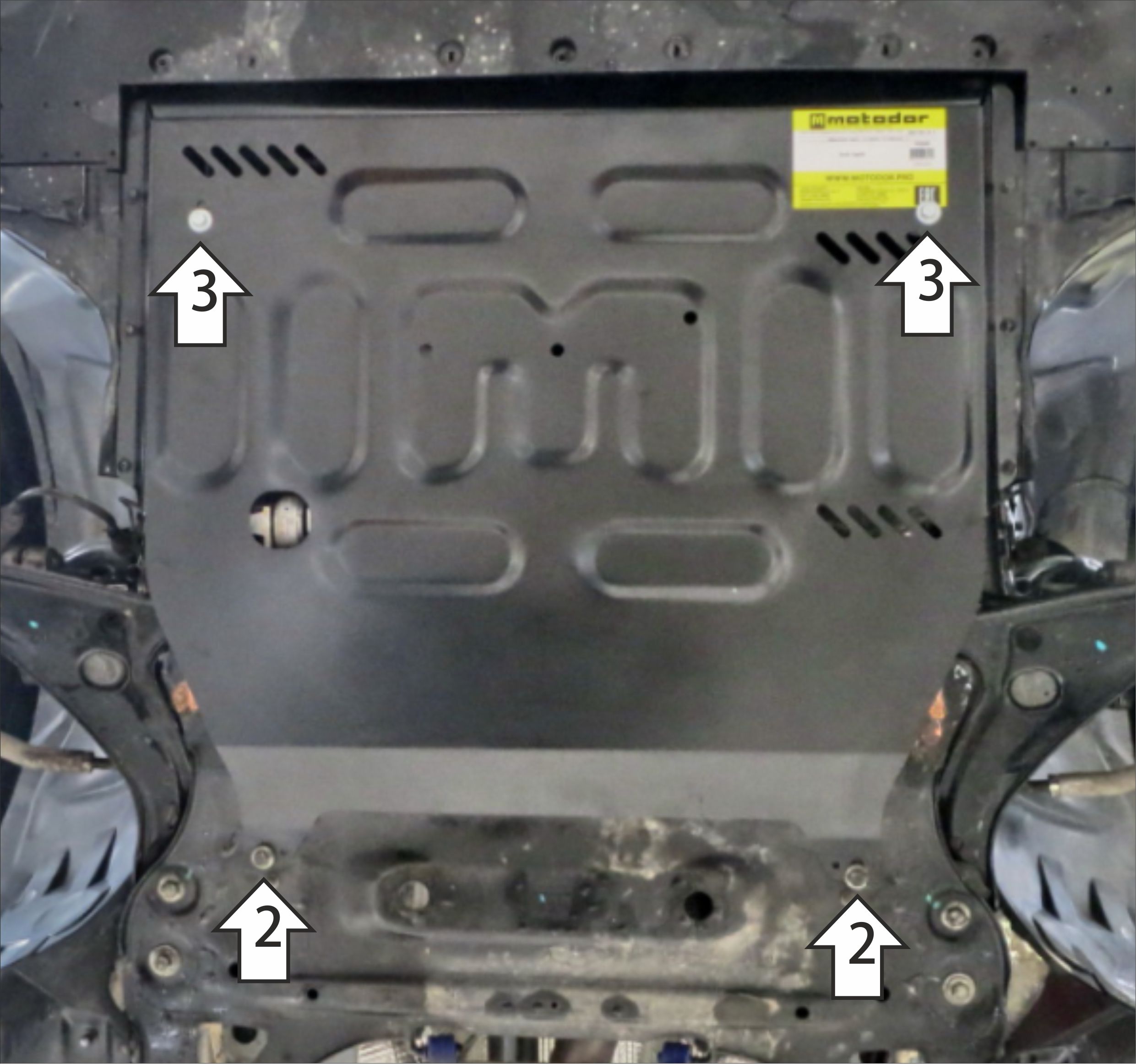 1. Снять штатный пыльник. Установить кронштейны под штатные болты на фланцах лонжеронов автомобиля. 2. Под штатные болты в подрамнике автомобиля установить задние точки крепления щита. 3. Прикрепить щит к кронштейнам при помощи болтов М8х30 с шайбами и гр. шайбами 8. Затянуть весь крепеж с требуемым усилием.