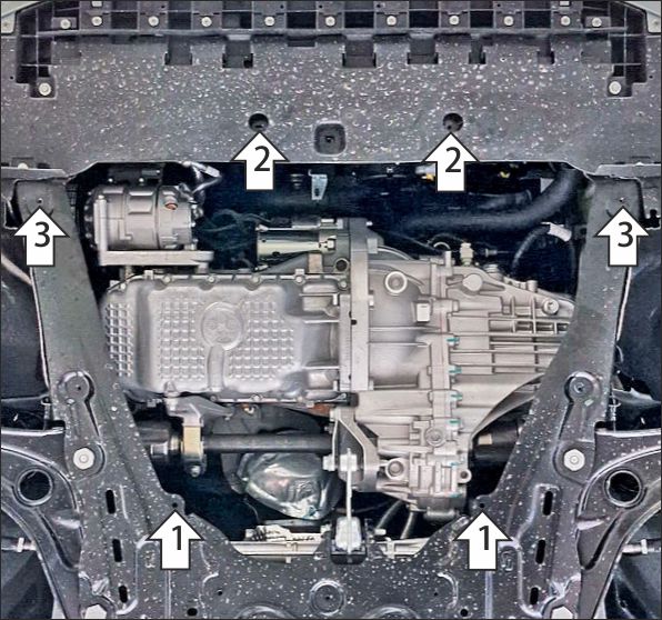 Снять штатный пыльник (больше не понадобится). 1. В штатные отверстия в подрамнике автомобиля установить задние точки крепления защиты при помощи КЛ 51х20 М8, болтов М8х30 с шайбами и гр. шайбами 8. 2. В штатные отверстия в рамке радиатора установить передние точки крепления щита защиты при помощи болтов М6х20 с шайбами и гр. шайбами 6: щит для этого необходимо положить сверху на нижнюю поперечину рамки радиатора. 3. В штатные резьбовые отверстия в продольных балках установить средние точки крепления щита при помощи Проставок 10, болтов М6х30 с шайбами и гр. шайбами 6. Затянуть весь крепеж с необходимым усилием.