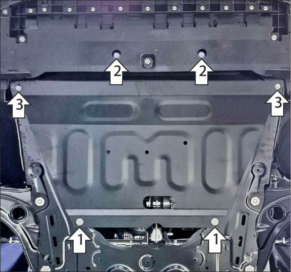 Снять штатный пыльник (больше не понадобится). 1. В штатные отверстия в подрамнике автомобиля установить задние точки крепления защиты при помощи КЛ 51х20 М8, болтов М8х30 с шайбами и гр. шайбами 8. 2. В штатные отверстия в рамке радиатора установить передние точки крепления щита защиты при помощи болтов М6х20 с шайбами и гр. шайбами 6: щит для этого необходимо положить сверху на нижнюю поперечину рамки радиатора. 3. В штатные резьбовые отверстия в продольных балках установить средние точки крепления щита при помощи Проставок 10, болтов М6х30 с шайбами и гр. шайбами 6. Затянуть весь крепеж с необходимым усилием.
