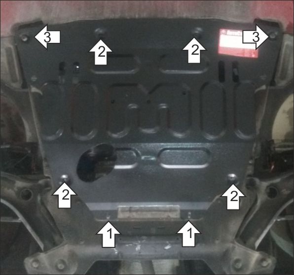 1. Снять штатный пыльник. В отверстия в подрамнике прикрепить задние точки крепления защиты при помощи болтов М6х30 с шайбами и гр. шайбами 6. 2. В штатные резьбовые отверстия в подрамнике установить средние и передние точки крепления защиты при помощи болтов М6х30 с шайбами и гр. шайбами 6. 3. Вывернуть штатные болты крепления подрамника и под них установить передние крайние точки крепления защиты. Затянуть весь крепеж с необходимым усилием.
