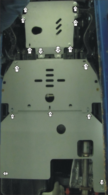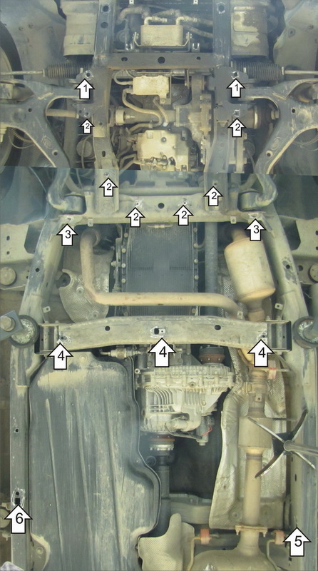1. Предварительно удалив штатный пластиковый пыльник, закрепить к раме передние точки первого щита при помощи ПР 50х20х6 М10, Болтов М10х30 с Шайбами и Гр. Шайбами 10. 2. Закрепить к подрамнику моторного отсека средние и задние точки защиты Болтами М10х30 с Шайбами и Гр. Шайбами 10 (на вторых точках сзади использовать Проставки 8 и Болты М10х40). 3. Установить на крепежные проушины КЛ 51х20 А40 М8 и закрепить передние точки второго щита Болтами М8х40 с Шайбами и Гр. Шайбами 8. 4. Закрепить к поперечной балке средние точки защиты, используя Проставки 15(для боковых), КЛ 51х20 А40 М8, Болтов М8х60, ПУ 60х14х6 А20 М8, Болта М8х40 с Шайбами и Гр. Шайбами 8. 5. Закрепить к раме в штатное отверстие Левый Кронштейн при помощи Планки с усиком специальной, Болта М8х30 с Шайбой и Гр. Шайбой 8. 6. На автомобилях выпуска с 2014 года установить Правый Кронштейн при помощи Планки с усиком специальной, Болта М8х30 с Шайбой и Гр. Шайбой 8. Между Кронштейном со стороны приварной гайки и рамой заложить Пластину Правую. 7. Закрепить к Кронштейнам (на автомобилях до 2014 года выпуска правая задняя точка крепится к раме без Кронштейна с помощью Пластины Правой, Планки с усиком специальной и Болта М8х40 с Шайбой и Гр. Шайбой 8) задние точки третьего щита Болтами М8х30 с Шайбами и Гр. Шайбами 10, предварительно заведя передние точки за второй щит.