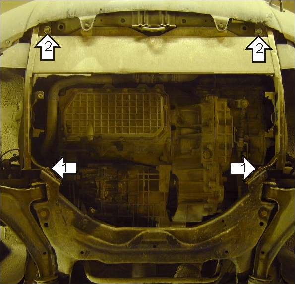 1.К приварным кронштейнам подрамника передней подвески закрепить Уголки С25 М10 Болтами М10х30. 2.Закрепить к подрамнику радиатора передние точки защиты на штатный крепеж. 3.Закрепить к Уголкам задние точки защиты, используя Болты М10х30 с Шайбами и Гр. Шайбами 10.