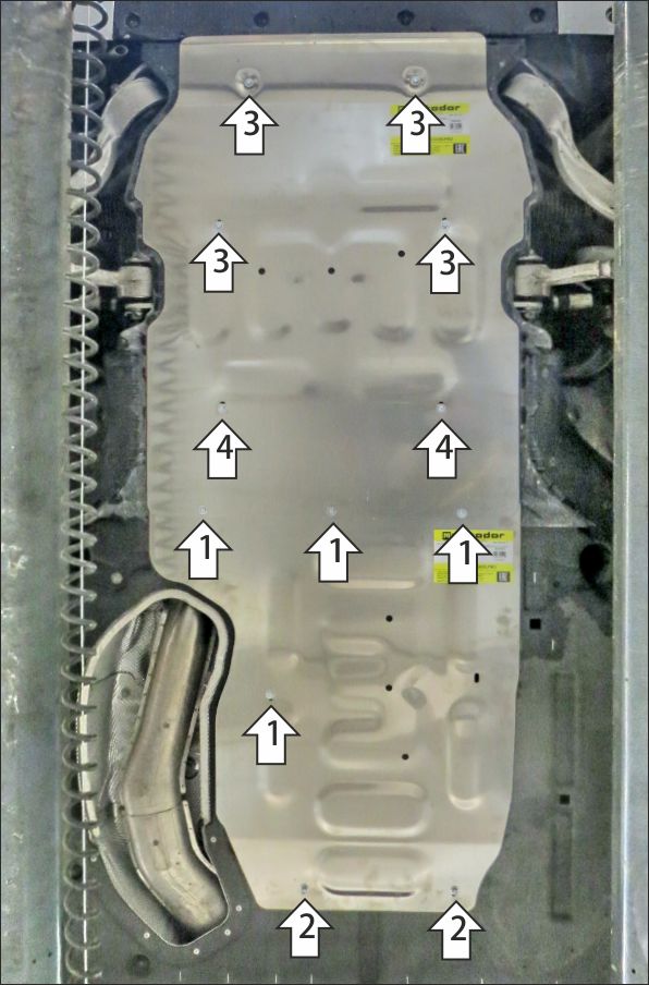 Защита устанавливается поверх штатного пыльника. Выкрутить штатные болты крепления пыльника, отмеченные п. 1-4 инструкции. 1. В штатные резьбовые отверстия прикрепить задний щит при помощи болтов М6х50 с шайбами и гр. шайбами 6. 2. В штатные резьбовые отверстия прикрепить задний щит при помощи болтов М6х40 с шайбами и гр. шайбами 6. 3. В штатные резьбовые отверстия прикрепить передний щит при помощи болтов М6х40 с шайбами и гр. шайбами 6. Передний щит устанавливается внахлёст на задний (задними точками крепления на болты из п.1 инструкции). 4. В штатные резьбовые отверстия прикрепить передний щит при помощи болтов М6х50 с шайбами и гр. шайбами 6.Затянуть весь крепеж с требуемым усилием.