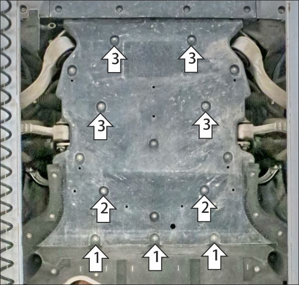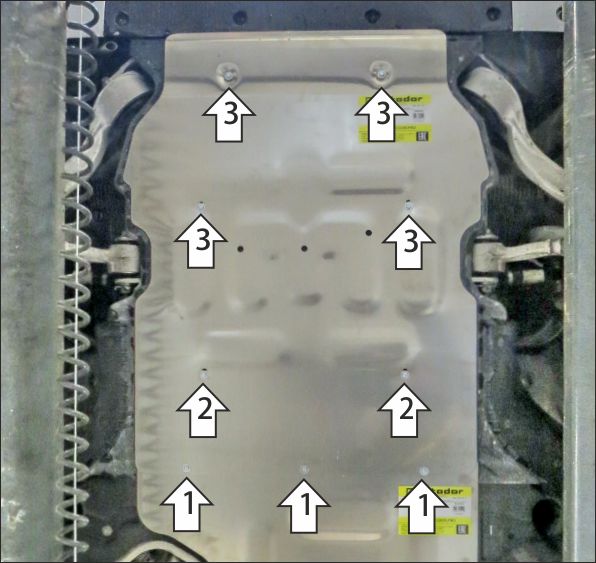 Защита устанавливается поверх штатного пыльника. Выкрутить штатные болты крепления пыльника, отмеченные п. 1-3 инструкции. 1. В штатные резьбовые отверстия прикрепить защиту при помощи болтов М6х50 с шайбами и гр. шайбами 6. 2. В штатные резьбовые отверстия прикрепить защиту при помощи болтов М6х50 с шайбами и гр. шайбами 6. 3. В штатные резьбовые отверстия прикрепить защиту при помощи болтов М6х40 с шайбами и гр. шайбами 6. Затянуть весь крепеж с требуемым усилием.