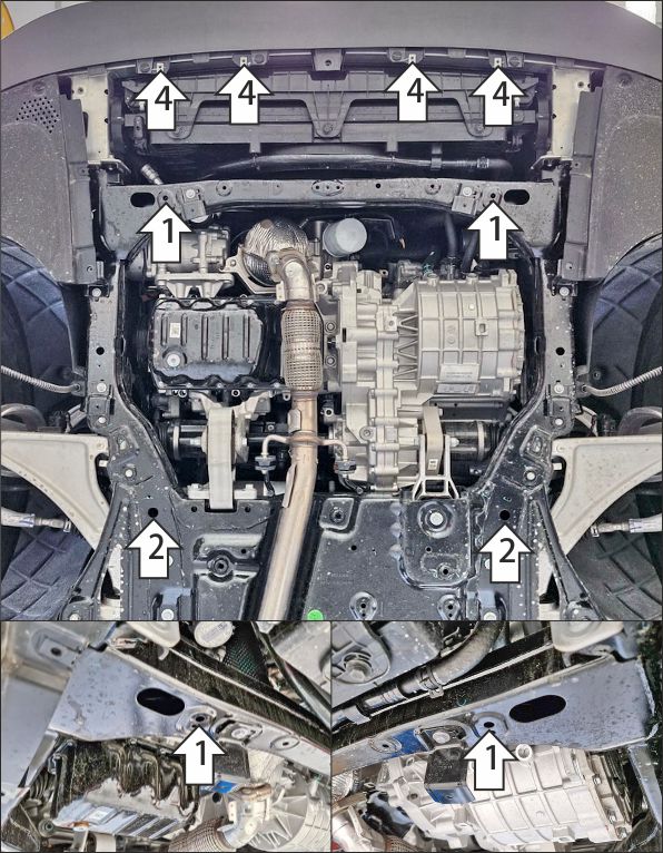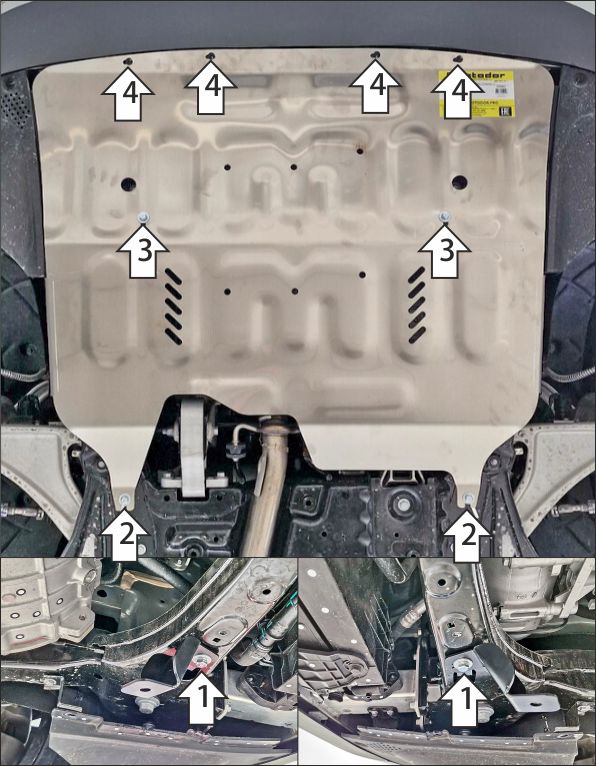 Снять штатный двухсоставной пластиковый пыльник (больше не понадобится). 1. В штатные отверстия в поперечине подрамника автомобиля установить кронштейны защиты при помощи клипс КЛ 51х20 М8 и болтов М8х30 с шайбами и гр. шайбами 8. 2. В штатные отверстия в подраминике автомобиля установить задние точки крепления защиты при помощи закладных планок ПУ 60х14х6 М8 и болтов М8х30 с шайбами и гр. шайбами 8. 3. Прикрепить щит к кронштейнам при помощи болтов М8х30 с шайбами и гр. шайбами 8. 4. В штатные резьбовые отверстия крепления пыльника к бамперу установить передние точки защиты при помощи штатных саморезов. Затянуть весь крепеж с требуемым усилием.