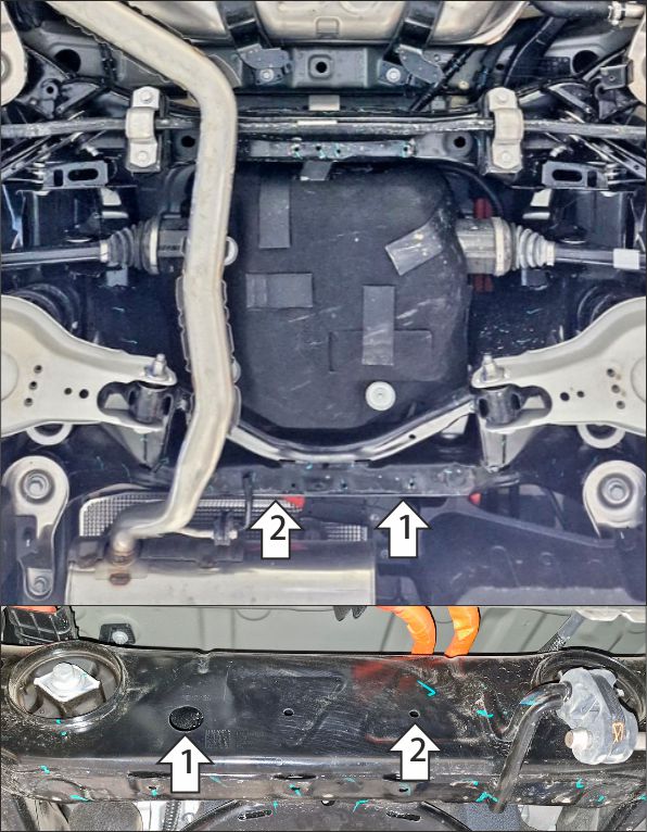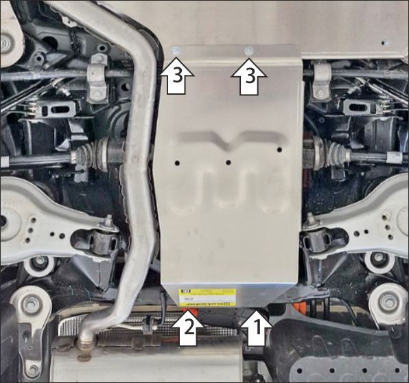 Защита устанавливается только совместно с защитой бака 349904 Motodor!!! 1. В штатное отверстие в подрамнике задней подвески установить одну из задних точек крепления щита при помощи закладной планки ПР 70х20х6 М10, болта М10х30 с шайбой и гр. шайбой 10. 2. В штатное отверстие в подрамнике задней подвески установить вторую заднюю точку крепления щита при помощи закладной планки, болта М8х30 с шайбой и гр. шайбой 8. 3. К задним кронштейнам защиты 349905 прикрепить передние точки щита. Затянуть весь крепеж с требуемым усилием.