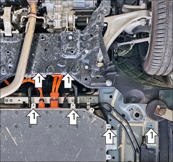 Снять штатную защиту передней кромки аккумулятора и штатный пыльник. 1. В штатные резьбовые отверстия крепления пыльника установить защиту при помощи болтов М6х30 с шайбами и гр. шайбами 6. 2. Вернуть на место штатную защиту передней кромки аккумулятора. Затянуть весь крепеж с требуемым усилием.