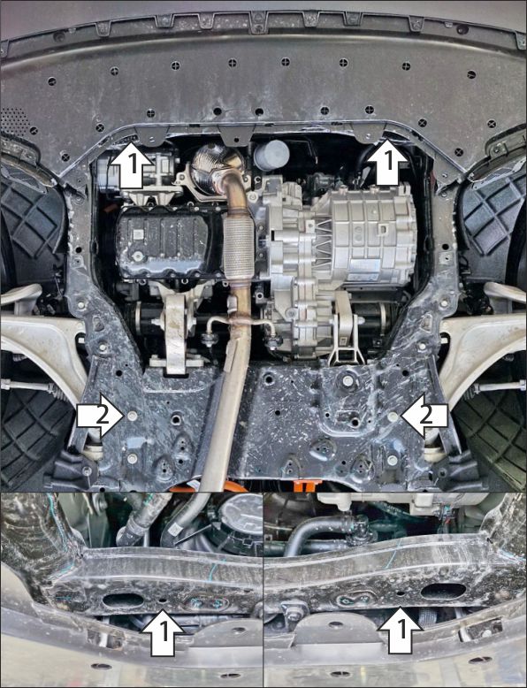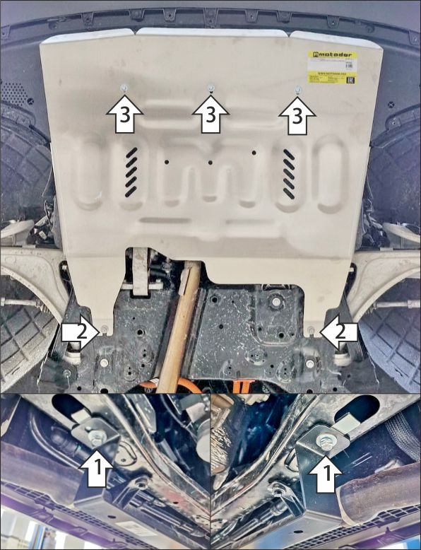 Снять штатный пыльник под двигателем и радиатором. 1. В штатные отверстия в поперечине подрамника автомобиля установить балку при помощи клипс КЛ 51х20 М8 и болтов М8х30 с шайбами и гр. шайбами 8. Вернуть на место пыльник под радиатором, проделать в нём отверстия под болты крепления щита. 2. Под штатные болты в подрамнике подвески установить задние точки крепления защиты. 3. Прикрепить щит к балке при помощи болтов М8х30 с шайбами и гр. шайбами 8. Затянуть весь крепеж с требуемым усилием.