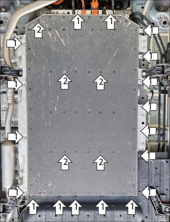 Выкрутить все необходимые для установки обоих щитов защиты штатные болты пыльника аккумуляторной батареи. 1. В штатные резьбовые отверстия крепления пыльников к аккумуляторной батарее установить передние, задние и боковые точки крепления щитов при помощи болтов М6х20 с шайбами и гр. шайбами 6. 2. В штатные резьбовые отверстия в аккумуляторной батарее установить центральные точки крепления щитов при помощи, болтов М5х35 DIN 912 с шайбами 6 и гр. шайбами 5. Затянуть весь крепеж с требуемым усилием.
