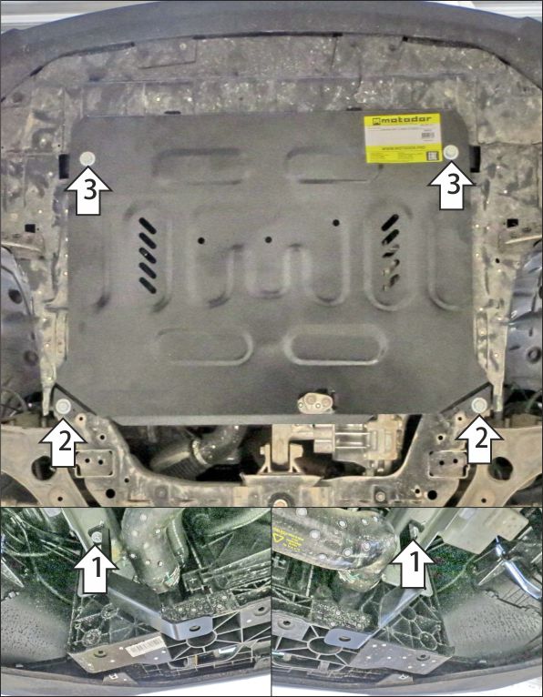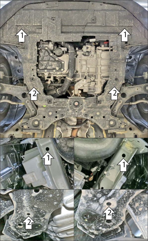 Для удобства монтажа снять штатный пластиковый пыльник. 1. В штатные отверстия в лонжеронах автомобиля установить передние кронштейны защиты картера при помощи закладных планок ПУ 60х14х6 M8, болтов М8х30 с шайбами и гр. шайбами 8. Вернуть на место штатный пыльник, предварительно сделав в нём вырезы под кронштейны. 2. В штатные отверстия в подрамнике автомобиля установить задние точки крепления защиты при помощи закладных планок ПР 70х20х6 М10, болтов М10х30 с шайбами и гр. шайбами 10. 3. Прикрепить щит к кронштейнам при помощи болтов М10х30 с шайбами и гр. шайбами 10. Затянуть весь крепеж с необходимым усилием.
