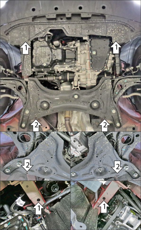 Для удобства монтажа снять штатный пластиковый пыльник. 1. В штатные отверстия в лонжеронах автомобиля установить передние кронштейны защиты картера при помощи закладных планок ПУ 60х14х6 M8, болтов М8х30 с шайбами и гр. шайбами 8. Вернуть на место штатный пыльник, предварительно сделав в нём вырезы под кронштейны. 2. В штатные отверстия в подрамнике автомобиля установить задние точки крепления защиты при помощи закладных планок ПР 70х20х6 М10, болтов М10х30 с шайбами и гр. шайбами 10. 3. Прикрепить щит к кронштейнам при помощи болтов М10х30 с шайбами и гр. шайбами 10. Затянуть весь крепеж с необходимым усилием.