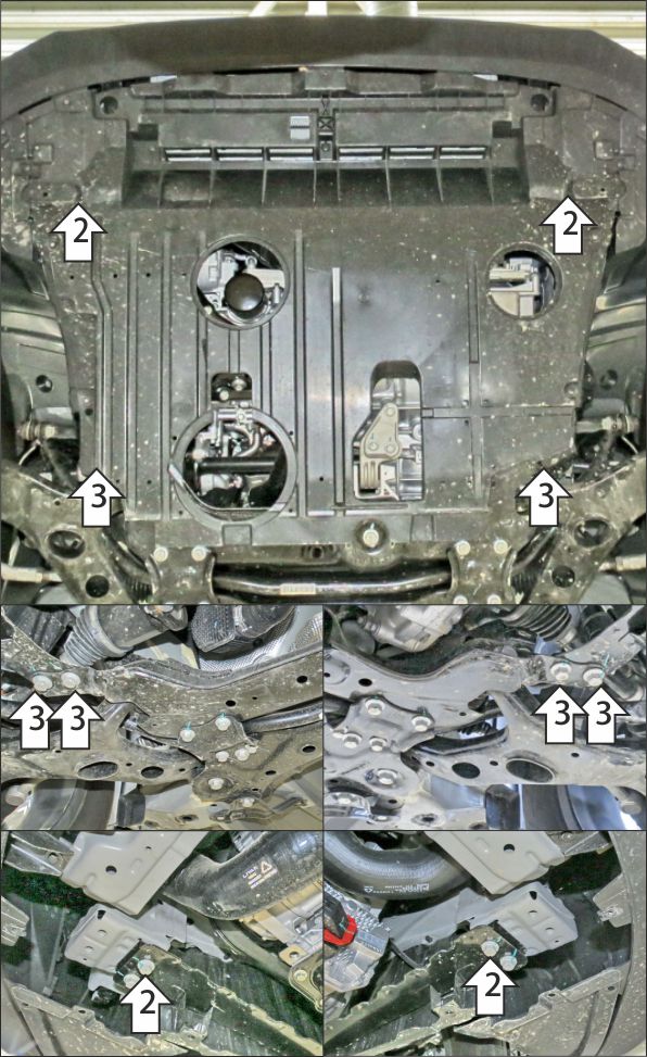 1. Снять штатный пластиковый пыльник. 2. Под передние штатные болты крепления усилителей лонжеронов установить передние кронштейны защиты картера. Вернуть на место пластиковый пыльник, предварительно сделав в нём вырезы под кронштейны. 3. Под задние штатные болты крепления усилителей лонжеронов к подрамнику установить задние точки крепления защиты картера. 4. Прикрепить щит к кронштейнам при помощи болтов М10х20 с шайбами и гр. шайбами 10. Затянуть весь крепеж с необходимым усилием.