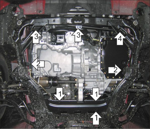 1. Прикрепить к подрамнику задние точки крепления защиты при помощи болтов М6х30 шайб 10, шайб и гр. шайб 6 (на автомобилях 2005-2007 г.в. одна точка крепления смещена по ходу движения на 80мм назад, для этих модификаций к защите предварительно прикрепить кронштейн при помощи гайки М8 с шайбой и гр. шайбой 8). 2. Прикрепить к подрамнику средние точки крепления защиты, используя болты М6х30, шайбы 10, шайбы и гр. шайбы 6. 3. Прикрепить к подрамнику переднюю среднюю и правую точки крепления защиты при помощи проставок 15, болтов М6х40, шайб 10, шайб и гр. шайб 6. 3. Прикрепить к подрамнику переднюю левую точки крепления защиты при помощи проставки 10, болта М6х40, шайбы 10, шайбы и гр. шайбы 6. Затянуть все болтовые соединения с требуемым усилием.