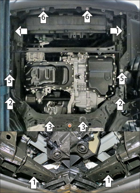 1. Снять штатный пыльник. В штатные отверстия прикрепить кронштейны при помощи планок ПЗ61х20х6 М10 и болтов М10х60 с шайбами и гр. шайбами 10. 2. В штатные отверстия в подрамнике подвески установить средние точки крепления щита при помощи планок ПР50х20х6 М8 и болтов М8х20 с шайбами и гр. шайбами 8. 3. В штатные резьбовые отверстия в подрамнике подвески установить задние точки крепления щита при помощи болтов М6х20 с шайбами и гр. шайбами 6. 4. Прикрепить щит к кронштейнам при помощи болтов М8х20 с шайбами и гр. шайбами 8. 5. Прикрепить боковые пыльники к щиту при помощи штатных винтов. 6. Прикрепить щит к переднему бамперу при помощи штатных саморезов. Затянуть весь крепеж с необходимым усилием.