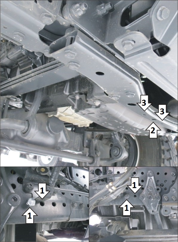 1. Снять штатный пыльник при его наличии. Установить в отверстия рамы автомобиля кронштейны при помощи болтов М16х50, гаек М16 и Шайб 16. 2. Установить переднюю часть щита в штатное отверстие в поперечине рамы при помощи болта М16х70 с шайбами 16 и гайкой М16 (расположение отверстия в защите см. схему установки). 3. Для автомобилей с передним ведущим мостом прикрепить переднюю часть щита в штатные отверстия в поперечине рамы при помощи двух болтов М12х80 с шайбами 12 и гайками М12. 4. Прикрепить щит к кронштейнам при помощи болтов М14х40, гаек М14 и шайб 14. Затянуть весь крепеж.