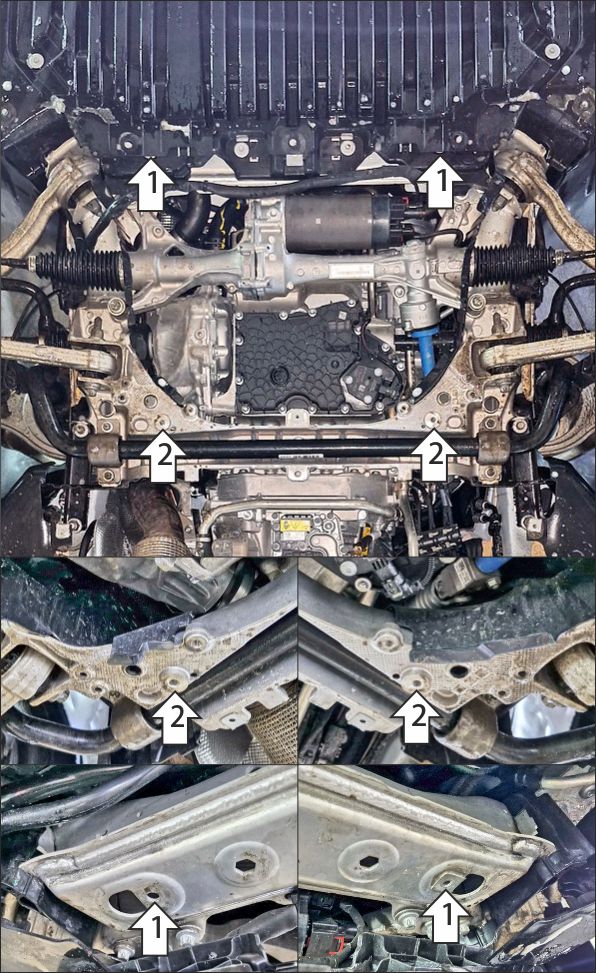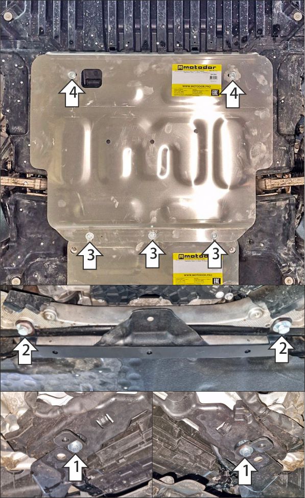Снять штатный пыльник двигателя вместе с его пластиковым креплением к рамке радиатора. 1. Заменить штатные клипсы крепления пластикового кронштейна пыльника к рамке радиатора на КЛ 31х14 М8. Вернуть пластиковый кронштейн пыльника на место, не используя резьбовые отверстия, образованные замененными клипсами. Используя эти резьбовые отверстия установить передние кронштейны защиты при помощи проставок 20 и болтов М8х50 с шайбами и гр. шайбами 8. 2. В штатные резьбовые отверстия в подрамнике автомобиля установить заднюю балку защиты картера при помощи болтов М10х20 с шайбами и гр. шайбами 10. Вернуть на место штатный пыльник двигателя, предварительно сделав в нем круглые отверстия для прикручивания щита к кронштейнам и балке, а также удалить ребра жесткости в местах прилегания кронштейнов к нему и выхода балки из-под него. 3. Прикрепить щит к балке при помощи болтов М8х30 с шайбами и гр. шайбами 8. 4. Прикрепить щит к кронштейнам при помощи болтов М8х25 с шайбами и гр. шайбами 8. Затянуть весь крепеж с требуемым усилием.