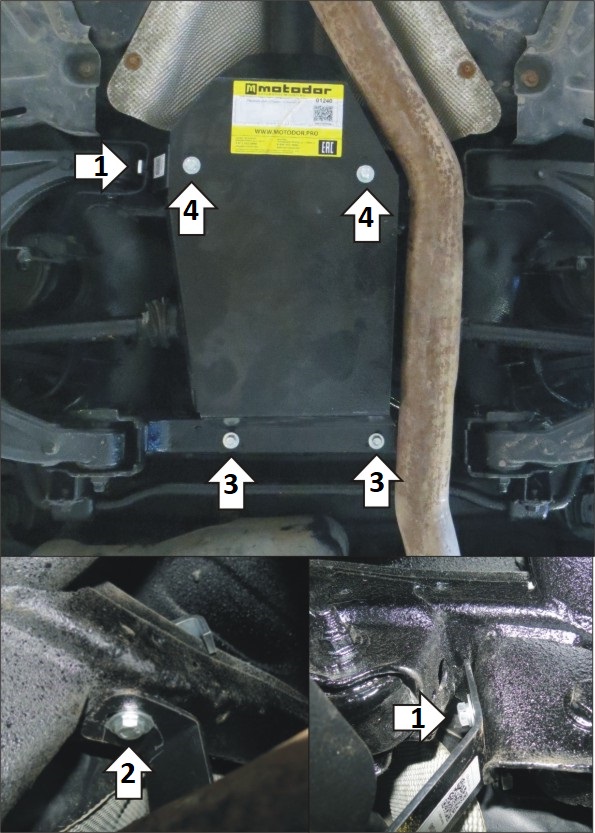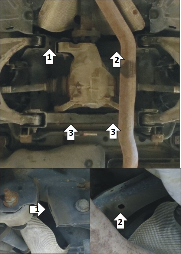 1. Прикрепить балку в штатное отверстие в подрамнике подвески при помощи планки ПР70х20 М10 болта М10х20 с шайбой и гр. шайбой 10. 2. Прикрепить балку в штатное сквозное отверстие в подрамнике подвески при помощи планки ПЗ79х20 М10 болта М10х90 с шайбой и гр. шайбой 10. 3. В штатные отверстия в подрамнике подвески установить задние точки крепления щита при помощи планок ПР50х20 М8, болтов М8х20 с шайбами и гр. шайбами 8. 4. Прикрепить щит к балке при помощи болтов М8х20 с шайбами и гр. шайбами 8. Затянуть весь крепеж.