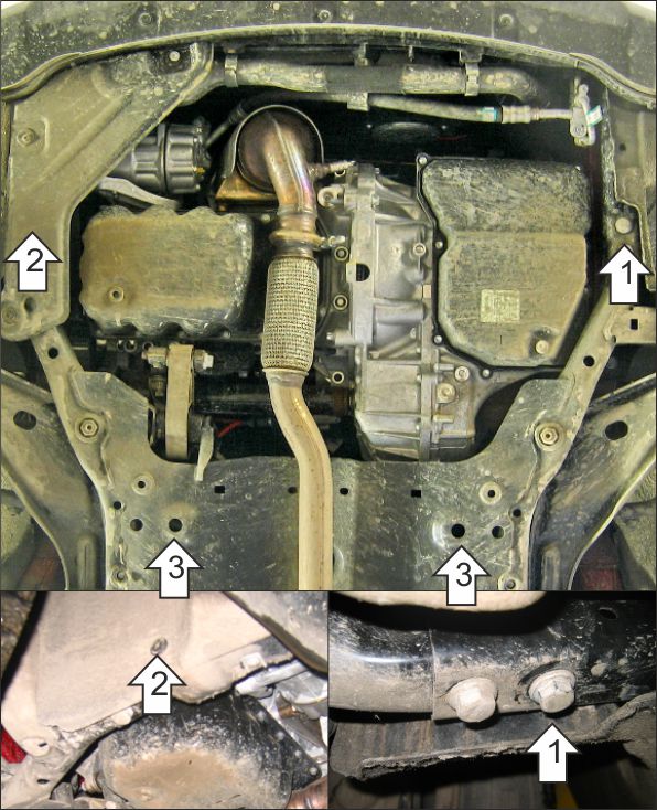 1. Под штатный болт на левом лонжероне установить кронштейн 02. 2. Сквозь штатное отверстие в правом лонжероне закрепить уголок А50 при помощи болтам М10х70 с шайбой и гр. шайбой 10. Болт вставляется со стороны колёсной арки, уголок - с внутренней стороны лонжерона. 3. В штатные отверстия подрамника передней подвески установить задние точки крепления щита при помощи планок ПУ 60х14х6 М8 и болтов М8х30 с шайбами и гр. шайбами 8. 4. Прикрепить к уголку и кронштейну передние точки крепления щита при помощи болтов М10х20 с шайбами и гр. шайбами 10. Затянуть все элементы крепления с необходимым усилием.