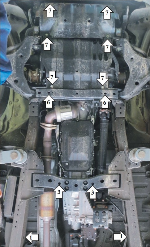 Защита устанавливается на Mitsubishi L200 только с МКПП. 1. Прикрепить Кронштейны к раме автомобиля в штатное резьбовое отверстие справа при помощи Болта М8х30 с Шайбой и Гр. шайбой 8 и в отверстие в раме автомобиля при помощи Закладной (Закладную заводить с наружной стороны рамы), Гайки М8 с Шайбой и Гр. Шайбой 8 слева. 2. Прикрепить Балку к Кронштейнам при помощи Болтов М10х20 с Шайбами и Гр. Шайбами 10. 3. Прикрепить Щит 4 к поперечине рамы при помощи Закладных Планок ПЗ 79х20х6 М10, Болтов М10х30 с Шайбами и Гр. Шайбами 10. 4. Прикрепить Щит 4 к Балке при помощи Болтов М10х20 с Шайбами и Гр. Шайбами 10. 5. Совместно с передними точками крепления Щита 4 прикрепить задние точки крепления Щита 3. 6. Прикрепить передние точки крепления Щита 3 в штатные отверстия поперечины рамы при помощи Закладных планок ПР 70х20х6 М10, Болтов М10х30 с Шайбами и Гр. Шайбами 10. 7. Снять штатные защиты и прикрепить в штатные резьбовые отверстия Щит 2 и Щит 1 при помощи Болтов М8х30 с Шайбами и Гр. Шайбами 8. Затянуть весь крепеж.