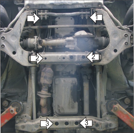 1. Установить на место крепления поперечного усилителя Уголок при помощи штатной гайки. 2. Установить на поперечную балку передней подвески задние точки крепления первого Щита и передние точки крепления второго Щита при помощи ПР80х20х6 М10, Болтов М10х30, Шайб 10 и Гроверов 10. 3. Установить на поперечную балку задние точки крепления второго Щита Защиты при помощи ПР 80х20х6 М10, Болтов М10х30, Шайб 10 и Гроверов 10. 4. Установить на раннее установленные Уголки передние точки крепления первого Щита Защиты при помощи Болтов М10х20, Шайб 10 и Гроверов 10.