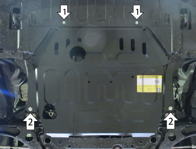 1. Снять штатный пластиковый пыльник. Установить в штатные резьбовые отверстия передние точки защиты при помощи Болтов М6х30, Гроверов 6 и Шайб 6. 2. Установить в сквозные отверстия подрамника задние точки защиты при помощи ПР 50х20х6 М8, Болтов М8х50, Гроверов 8 и Шайб 8 (при этом, для правой точки, наживлять Болт в Планку, придерживая её через отверстие для слива масла; для левой точки отогнув боковой пыльник).