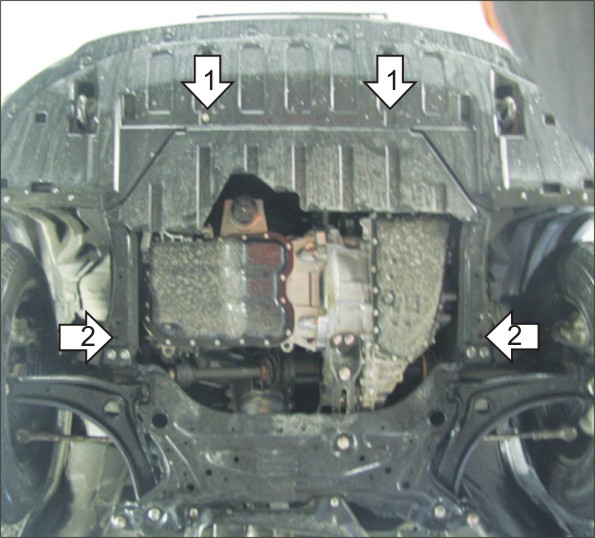 1. Снять штатный пластиковый пыльник. Установить в штатные резьбовые отверстия передние точки защиты при помощи Болтов М6х30, Шайб 6 и Гроверов 6. 2. Установить в сквозные отверстия подрамника задние точки защиты при помощи ПР 50х20х6 М8, Болтов М8х50, Гроверов 8 и Шайб 8 (при этом, для правой точки, наживлять Болт в планку, придерживая её через отверстие для слива масла; для левой точки, отогнув боковой пыльник).