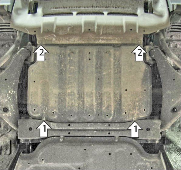 1. Снять штатный пыльник. Установить в штатные резьбовые отверстия задние точки крепления защиты при помощи болтов М8х20 с шайбами и гр. шайбами 8. 2. Установить в штатные резьбовые отверстия передние точки крепления защиты при помощи болтов М8х20 с шайбами и гр. шайбами 8. Затянуть весь крепеж с необходимым усилием.