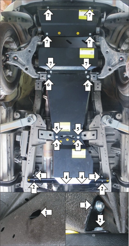 Защита устанавливается на Mitsubishi L200 только с АКПП. 1. Прикрепить Кронштейны к раме автомобиля в штатное резьбовое отверстие справа при помощи Болта М8х30 с Шайбой и Гр. Шайбой 8 и в отверстие в раме автомобиля при помощи Закладной (Закладную заводить с наружной стороны рамы), Гайки М8 с Шайбой и Гр. Шайбой 8 слева. 2. Прикрепить Балку к Кронштейнам при помощи Болтов М10х20 с Шайбами и Гр. Шайбами 10. 3. Прикрепить Щит 4 к поперечине рамы при помощи Закладных Планок ПЗ 79х20х6 М10, Болтов М10х30 с Шайбами и Гр. Шайбами 10. 4. Прикрепить Щит 4 к Балке при помощи Болтов М10х20 с Шайбами и Гр. Шайбами 10. 5. Совместно с передними точками крепления Щита 4 прикрепить задние точки крепления Щита 3. 6. Прикрепить передние точки крепления Щита 3 в штатные отверстия поперечины рамы при помощи Закладных планок ПР 70х20х6 М10, Болтов М10х30 с Шайбами и Гр. Шайбами 10. 7. Снять штатные защиты и прикрепить в штатные резьбовые отверстия Щит 2 и Щит 1 при помощи Болтов М8х30 с Шайбами и Гр. Шайбами 8. Затянуть весь крепеж.
