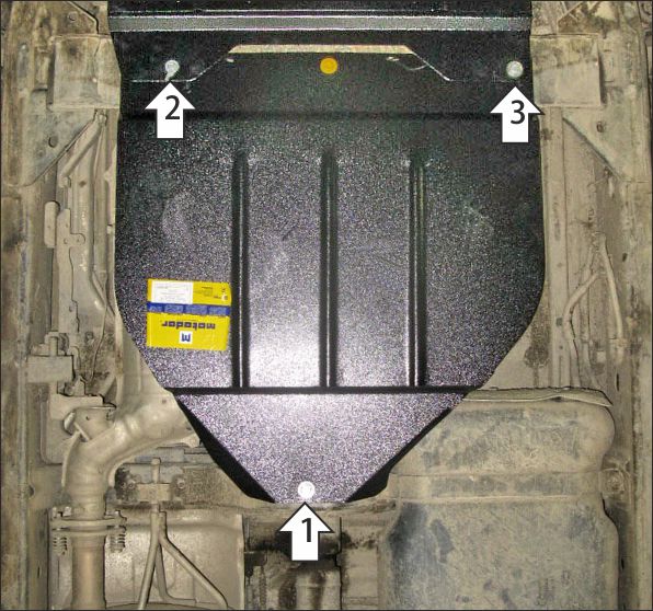 1. В штатное отверстие поперечины установить заднюю точку крепления защиты при помощи планки ПР 80х20х6 М10 (устанавливается внутрь поперечины) и болта М10х20 с шайбой и гр. шайбой 10. 2. В штатное отверстие поперечины установить переднюю правую точку крепления защиты при помощи планки ПЗ 79х20х6 М10 (устанавливается поверх поперечины) и болта М10х70 с шайбой и гр. шайбой 10. 3. В штатное отверстие поперечины установить переднюю левую точку крепления защиты при помощи планки ПЗ 79х20х6 М10 (устанавливается поверх поперечины) и болта М10х60 с шайбой и гр. шайбой 10. Затянуть весь крепеж с необходимым усилием.